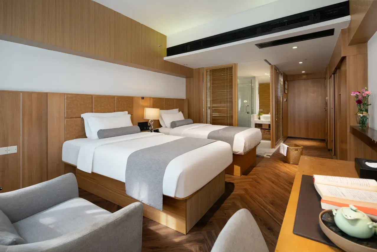 The Selected 2-bed Room is a spacious 28㎡ sanctuary designed for guests who prioritize comfort and shared space. Featuring two 1.2m wide single beds and a dedicated lounge area with a sofa and coffee table, this room is perfect for travel companions or small families. Located on floors 3 and 4, these rooms offer a bright atmosphere with windows and are fully accessible via our stair-free main entrance.